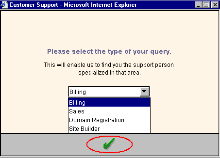 Select the problem category that best generalizes the issue you want to address with the Chat Technical Support Representatives, then click on the green checkmark to log in to the Live Customer Support system.