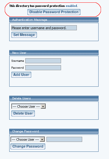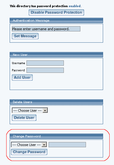 Once the Password Protection Tool detects that you have at least one user, you will have additional sections of "Delete Users" and "Change Password" below the section "New User".
