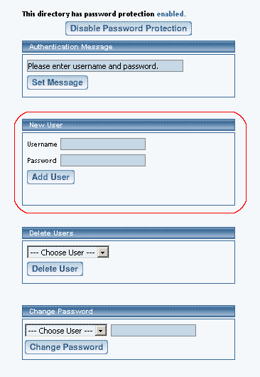 To add a new user for the password protected directory, enter in a username and password in the section "New User". Please keep in mind that the username and password can only consist of letters and numbers. When done, click on the button "Add User" to add your new user.